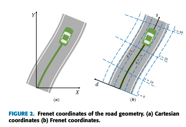 차량의 위치를 도로 중심선을 따라간 거리의 종방향 좌표 s, 중심선에서의 수직거리인 횡방향 좌표 d로 표현한다.