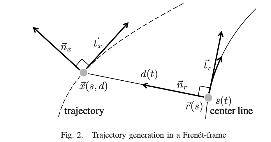 Cartesian coordinate은 Frenet coordinate으로 다음과 같이 표현된다. \(\mathbf{x}(s(t), d(t)) = \mathbf{r}(s(t)) + d(t)\,\mathbf{n}_r(s(t))\)