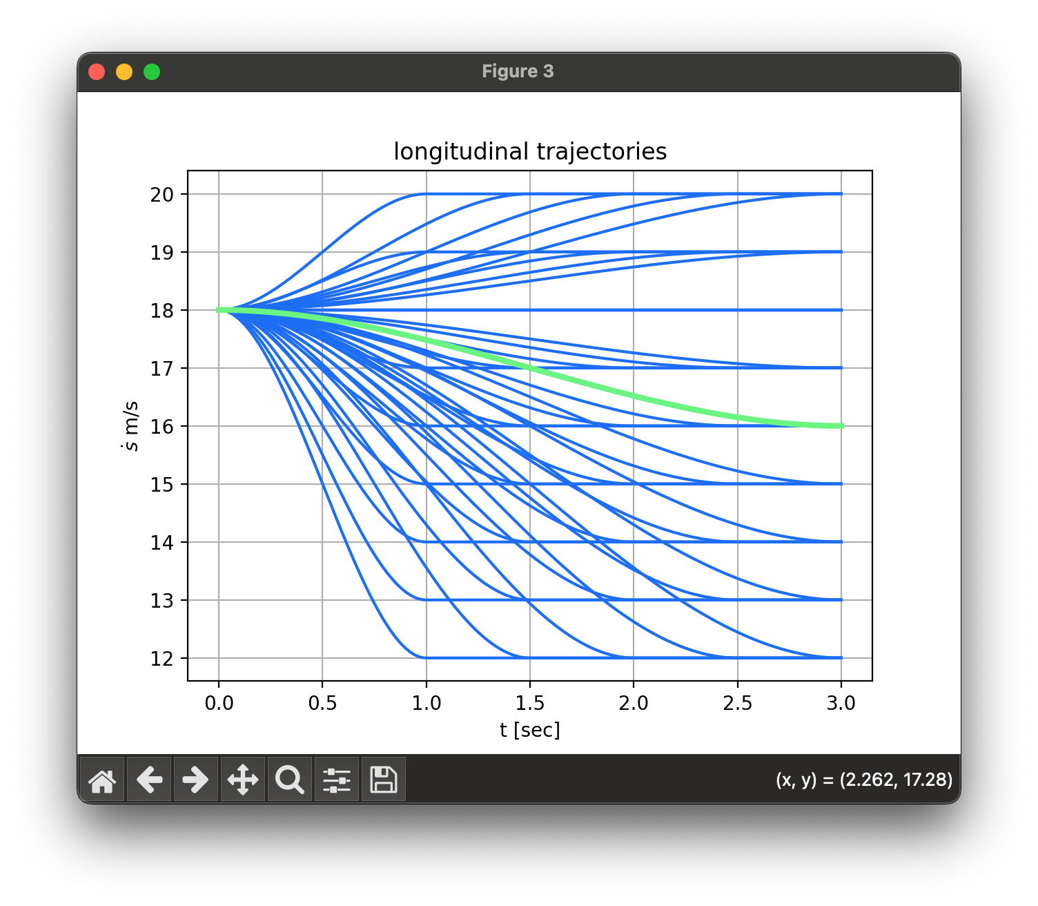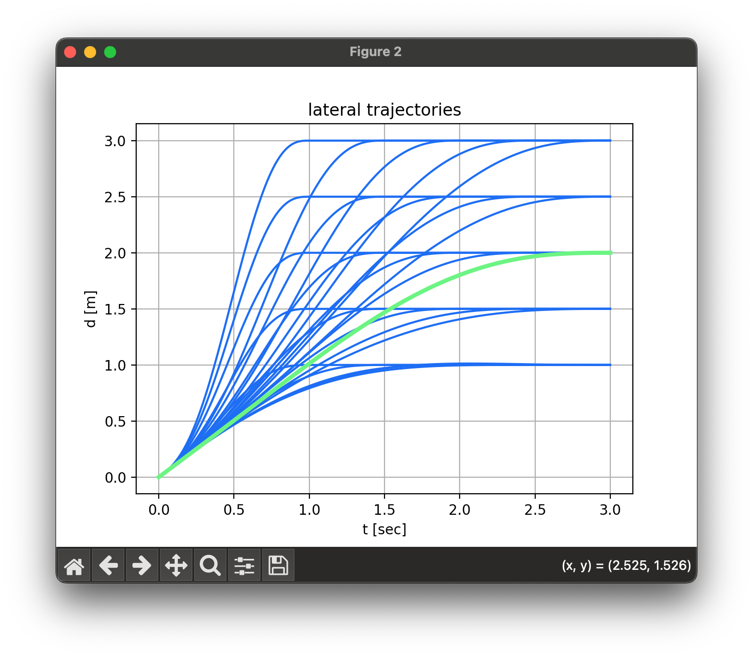 \[\begin{bmatrix} q_t^0 \\ q_t^1 \\ q_t^2 \end{bmatrix} = \underbrace{\begin{bmatrix} 1 & T & T^2 \\ 0 & 1 & 2T \\ 0 & 0 & 2 \end{bmatrix}}_{M_1} \begin{bmatrix} c_0 \\ c_1 \\ c_2 \end{bmatrix} + \underbrace{\begin{bmatrix} T^3 & T^4 & T^5 \\ 3T^2 & 4T^3 & 5T^4 \\ 6T & 12T^2 & 20T^3 \end{bmatrix}}_{M_2} \begin{bmatrix} c_3 \\ c_4 \\ c_5 \end{bmatrix}\] \[c_0 = q_i^0, \quad c_1 = q_i^1, \quad c_2 = \tfrac{1}{2} q_i^2\] \[\begin{bmatrix} c_3 \\ c_4 \\ c_5 \end{bmatrix} = M_2^{-1} \left( \begin{bmatrix} q_t^0 \\ q_t^1 \\ q_t^2 \end{bmatrix} - M_1 \begin{bmatrix} c_0 \\ c_1 \\ c_2 \end{bmatrix} \right)\]lateral trajectory