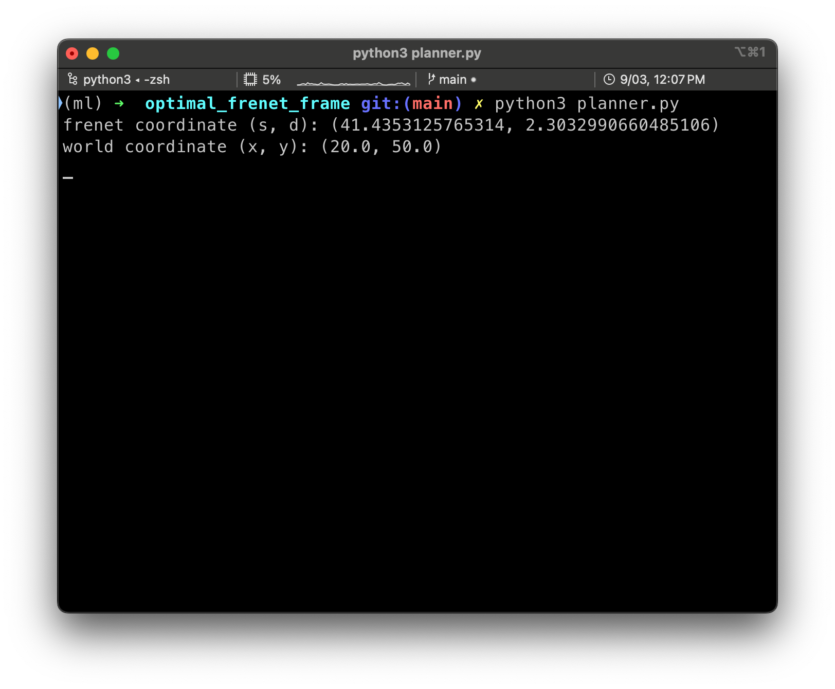 Frenet frame 상에서 가속도의 변화량인 jerk를 가장 최소화하는 polynomial을 이용해 안전하고 편안한 주행 경로를 만들어낸다. frenet frame을 사용하면 복잡한 도로 환경에서도 문제를 단순화할 수 있으며, 종방향과 횡방향을 나눠 경로를 생성하기 용이해진다. 이런 특성은 실제 사람이 운전하는 방식과 유사하게 주행 경로를 만들 수 있다.